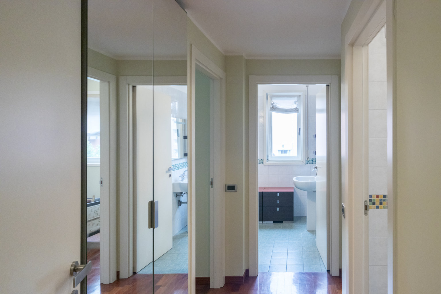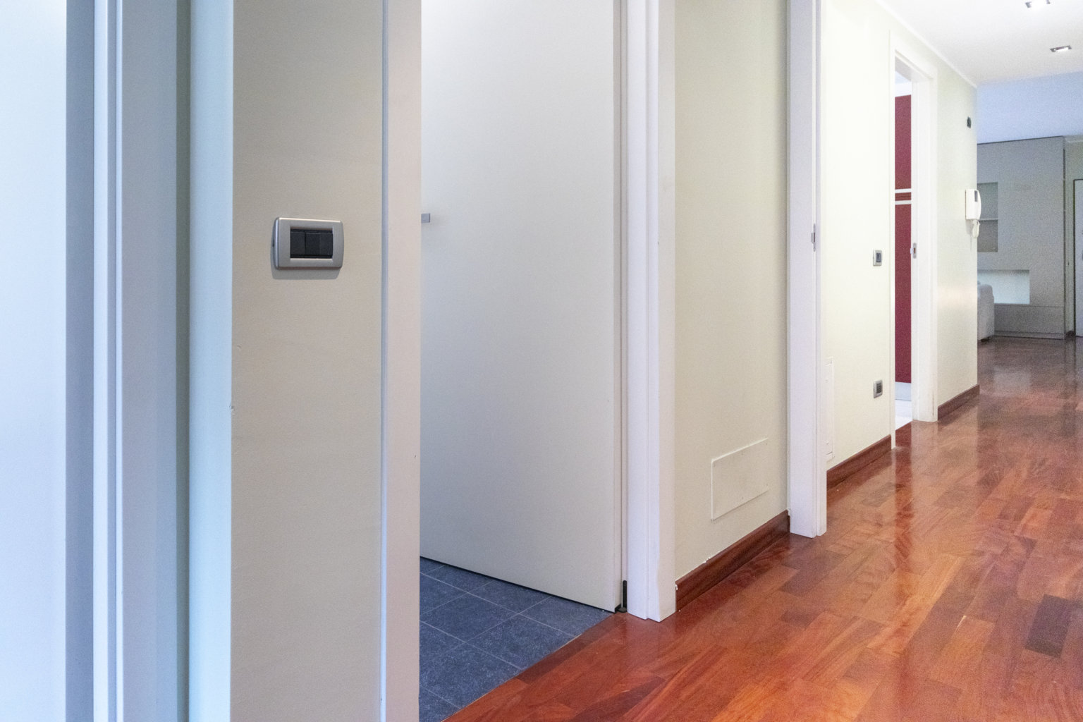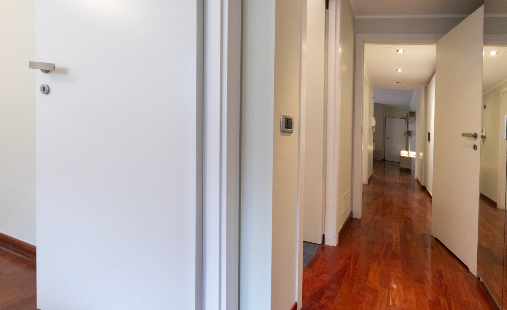 Gli interni sono caratterizzati da una meticolosa selezione di materiali. I pavimenti in pregiato parquet Doussiè Africano conferiscono calore e ricercatezza a tutti gli ambienti. Gli infissi in legno con doppi vetri e il portoncino d’ingresso blindato garantiscono isolamento acustico e sicurezza.