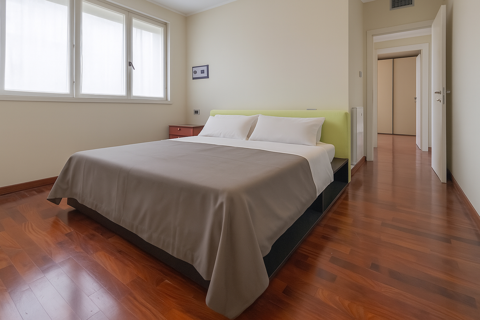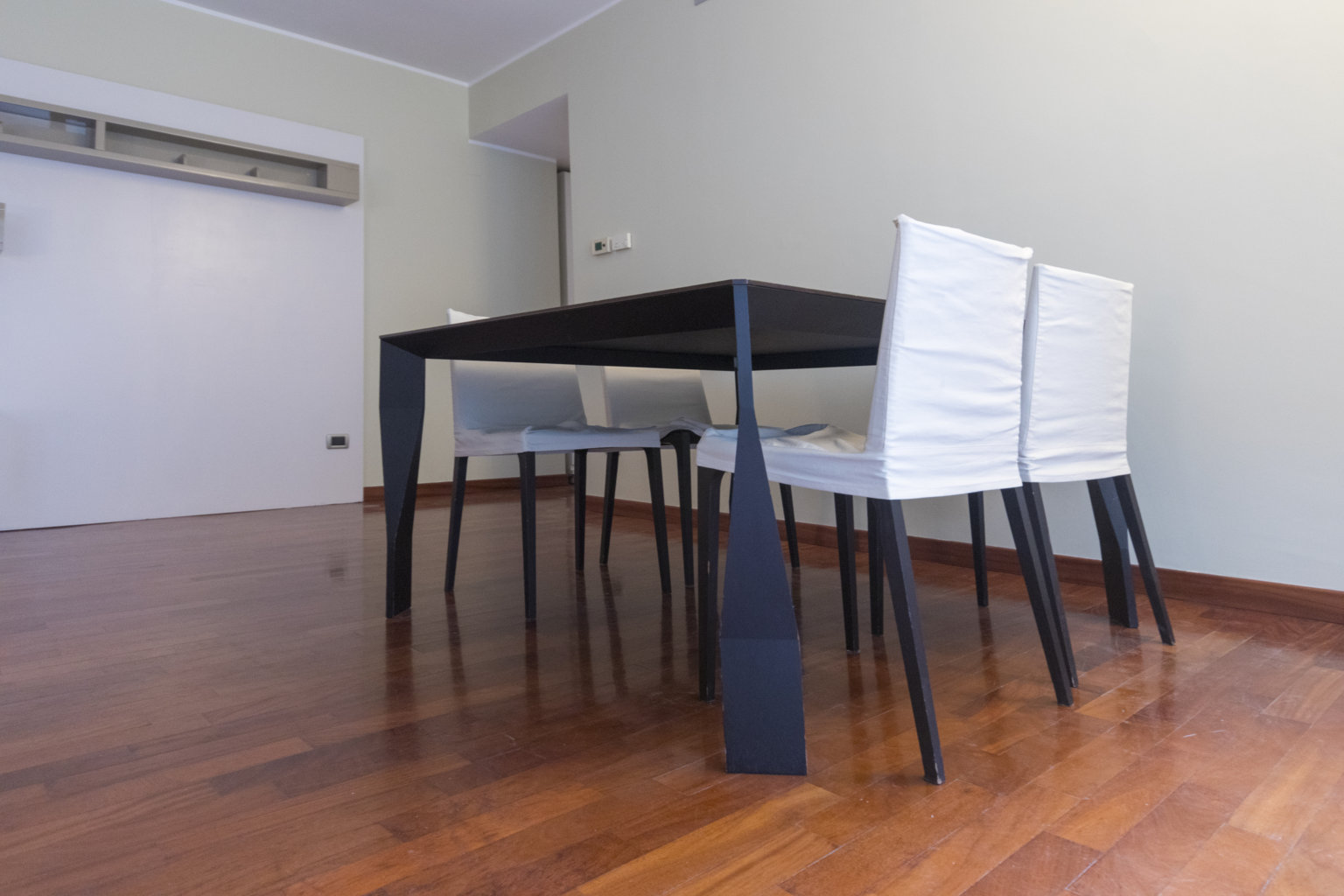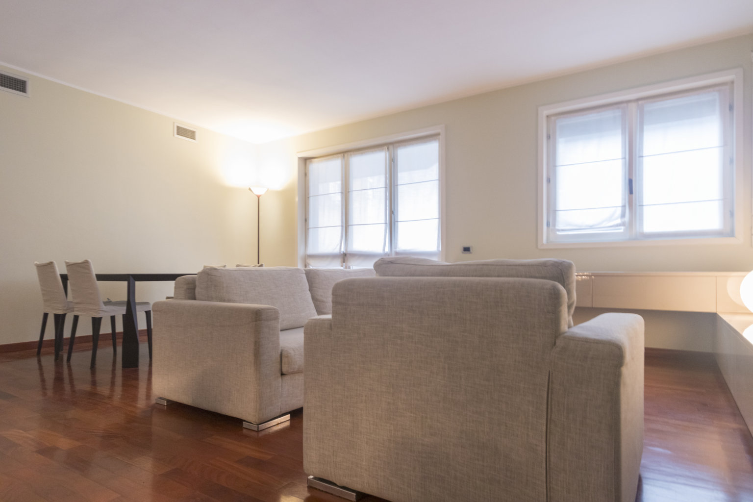 Gli interni sono caratterizzati da una meticolosa selezione di materiali. I pavimenti in pregiato parquet Doussiè Africano conferiscono calore e ricercatezza a tutti gli ambienti. Gli infissi in legno con doppi vetri e il portoncino d’ingresso blindato garantiscono isolamento acustico e sicurezza.