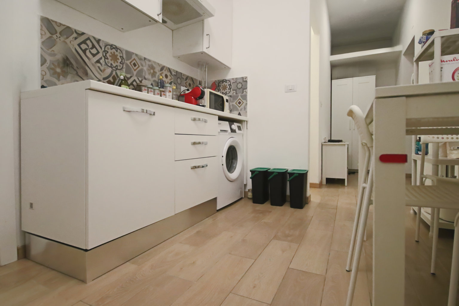 L’appartamento, situato al quinto piano senza ascensore, si sviluppa in uno spazio funzionale e moderno: un ingresso in disimpegno introduce alla zona giorno, caratterizzata da un vivace living con cucina a vista, mentre l’area notte comprende due accoglienti camere da letto e un bagno dotato di box doccia.